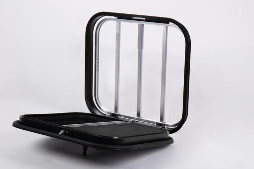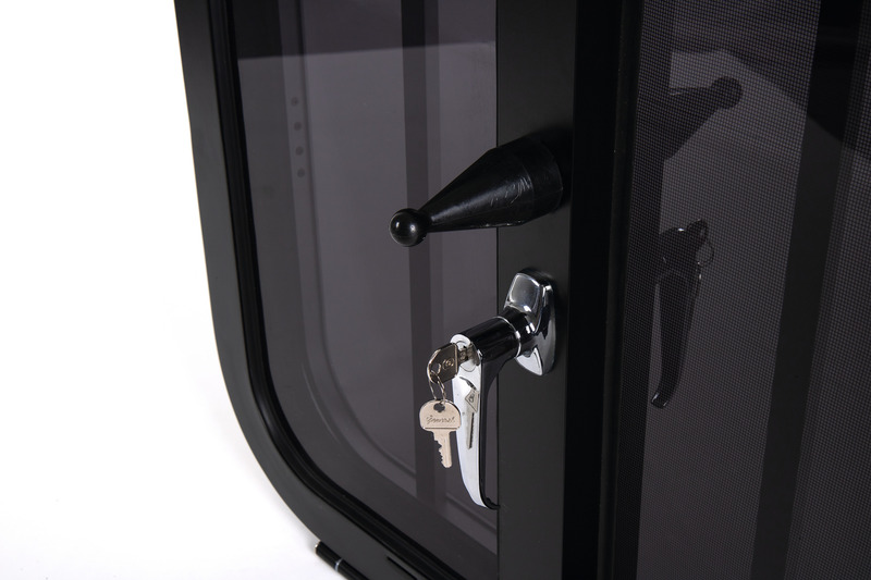 Fenster für Pferdeanhänger mit Schutzgitter. Bietet Belüftung sowie Schutz vor Insekten durch integriertes Moskitonetz. Lässt sich von außen verriegeln und abschließen. Für 40 mm Wandstärke. EcKradius 100 mm. TIPP: Auch als Sicherheitsfenster einsetzbar.
