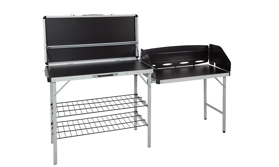 Die faltbare Outdoorküche besteht aus 2 Teilen: der Hauptteil mit einer großzügigen Arbeitsfläche, integriertem Gewürzregal und 2 Fächern für Küchenutensilien bietet genügend Platz zur Vorbereitung Ihrer Gerichte. Der zweite Teil ist etwas tiefer und speziell für den Einsatz von Campingkochern geeignet, hier macht sich der Windschutz der Küche besonders gut. Alle Oberflächen sind sehr reinigungsfreundlich und die verarbeiteten Materialien sehr robust und wetterbeständig. Die Outdoorküche lässt sich ganz einfach zusammenklappen und in der mitgelieferten Aufbewahrungstasche verstauen. Maße B 188 x H 81 x T 50 cm, Gewicht 17 kg.