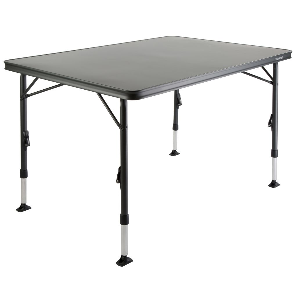 Leichter Campingklapptisch mit widerstandsfähiger Melamin-Tischplatte. Ausgestattet mit vier verstärkten regulierbaren Tischbeinen von 28 mm Durchmesser und seitlichen Verstrebungen, ist auf jedem Untergrund ein fester Stand gegeben.