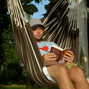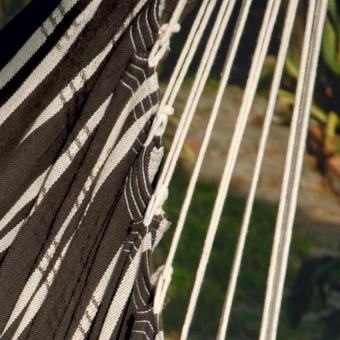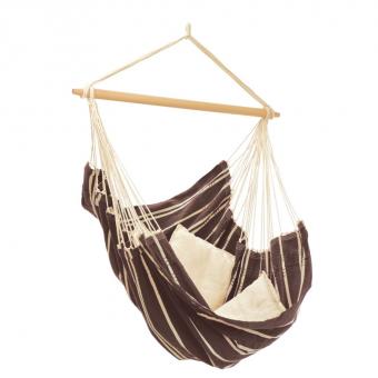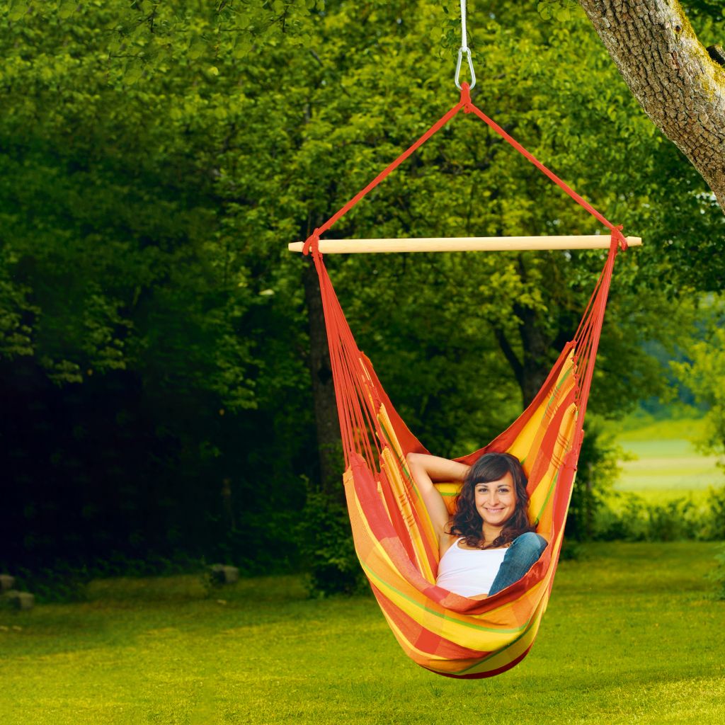 In diesem Hängesessel können Sie sanft schaukelnd wunderbar den Stress des Tages vergessen – oder erst gar nicht aufkommen lassen. Der kuschelweiche Stoff aus 85 % Baumwolle und 15 % Polyester ist in sorgfältiger Handarbeit in Brasilien gewebt und, wie alle brasilianischen Hängematten, besonders groß und bequem. Auch der kunstvoll gedrechselte Holzstab hat mit 1,10 m die richtige Länge, dass sich auch Sitzriesen bequem entspannen können. Das nur knapp 3 kg leichte Möbelstück ist überall mit einem Handgriff auf- oder weggehängt. Die dafür erforderliche Mindest-Raumhöhe ist ca. 2,20 m.