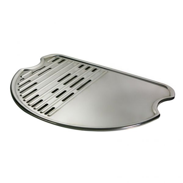 Eine Hälfte der Platte ist gerippt, die andere Hälfte ist glatt. Die Austauschplatte aus Edelstahl ist ideal zum Zubereiten von Fisch, Krustentieren, Gemüse oder Eiern auf der glatten Seite, und für Fleisch auf der gerippten Seite.