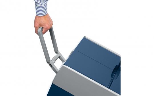 Qualitätsmerkmale: Zwei Spannungsbereiche für wahlweisen Einsatz im Pkw oder an einer Netzsteckdose, automatische Umschaltung, zwei robuste Räder und ausziehbarer Multifunktionsgriff für bequemen Transport, ausklappbare seitliche Tragegriffe, geteilter Deckel für minimalen Kälteverlust, Kabelfach im Deckel, Stehhöhe für 2-Liter-Flaschen, fasst eine ganze Getränkekiste (mit Abmessungen 30 x 40 x 32 cm), herausnehmbares Trenngitter.