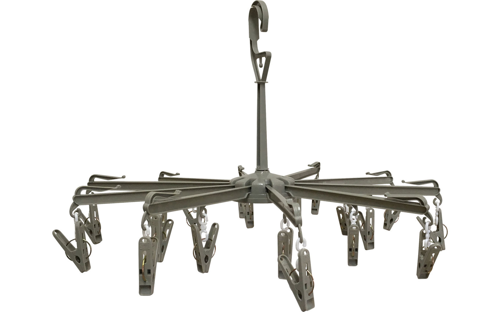 10-armige Miniwäschespinne. Stabile Aufhängung mit 20 Klammern. Vielseitig verwendbar, sehr platzsparend und wind-unempfindlich.