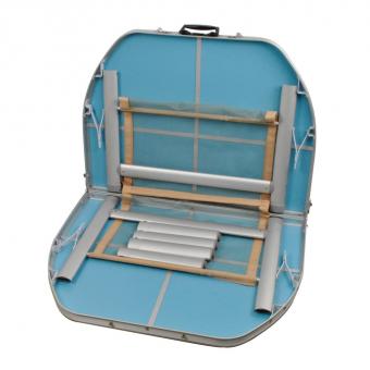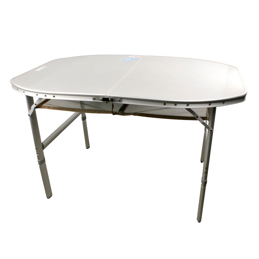 Aluminium Klapptisch mit wasserdichter Tischplatte. Jedes Tischbein ist höhenverstellbar. Praktisches Ablagenetz unter der Tischplatte. Wasserfest und hitzebeständig. Mit verstellbaren Füßen.