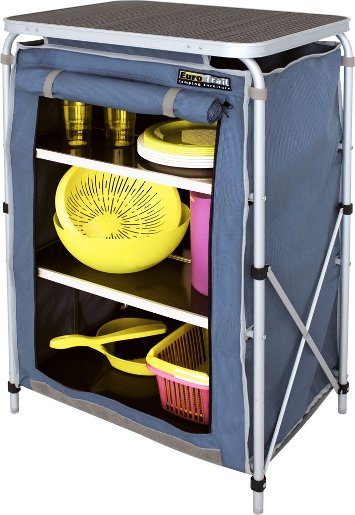 Mit 3 Ablageböden, dank seines mit Gelenken versehenen Aluminiumgestells binnen kurzer Zeit auf- und abgebaut. Der aus Polyester bestehende Bezug ist bereits vormontiert, eine oben aufgesetzte Arbeitsplatte sorgt für zusätzliche Stabilität. Im Lieferumfang ist eine praktische Packtasche enthalten. Maße B 60 × T 45 × H 92 cm, Gewicht 7,2 kg.