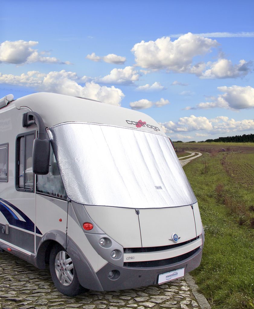 Für integrierte Reisemobile, hergestellt aus Thermofolie mit ringsum eingefassten Kanten. Die Thermomatte wird außen an der Frontscheibe befestigt. Ein innenliegender Gummispanner entlang der Oberkante sorgt für einen dichten Abschluss, entlang der Unterkante befinden sich 4 Abspannlaschen mit Kunststoffösen. Die im Lieferumfang enthaltenen Gummispanner können je nach Bedarf mit der Schere gekürzt werden. Sie werden an der Halterung des oben angebrachten Außenspiegels oder alternativ mittels der Schnapphaken der Gummispanner an optionalen LOXX-Druckknöpfen befestigt, diese können sowohl geklebt als auch geschraubt werden; Maße B 267 x H 130 cm.