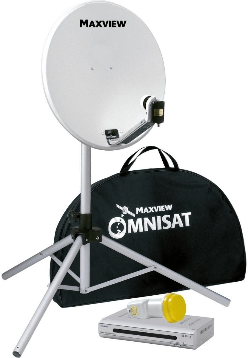 Komplett-Set, besteht aus Sat-Spiegel (wahlweise ø 54 oder 65 cm) mit klappbarem LNB-Arm, Sat-Stativ mit rotierendem Mastende, HD-Receiver und Easy Find LNB mit integriertem Sat-Finder mit Farb-LCD (die Farbe wechselt von Rot nach Gelb zu Grün). Untergebracht wird alles in einer hochwertigen, robusten Tragetasche.