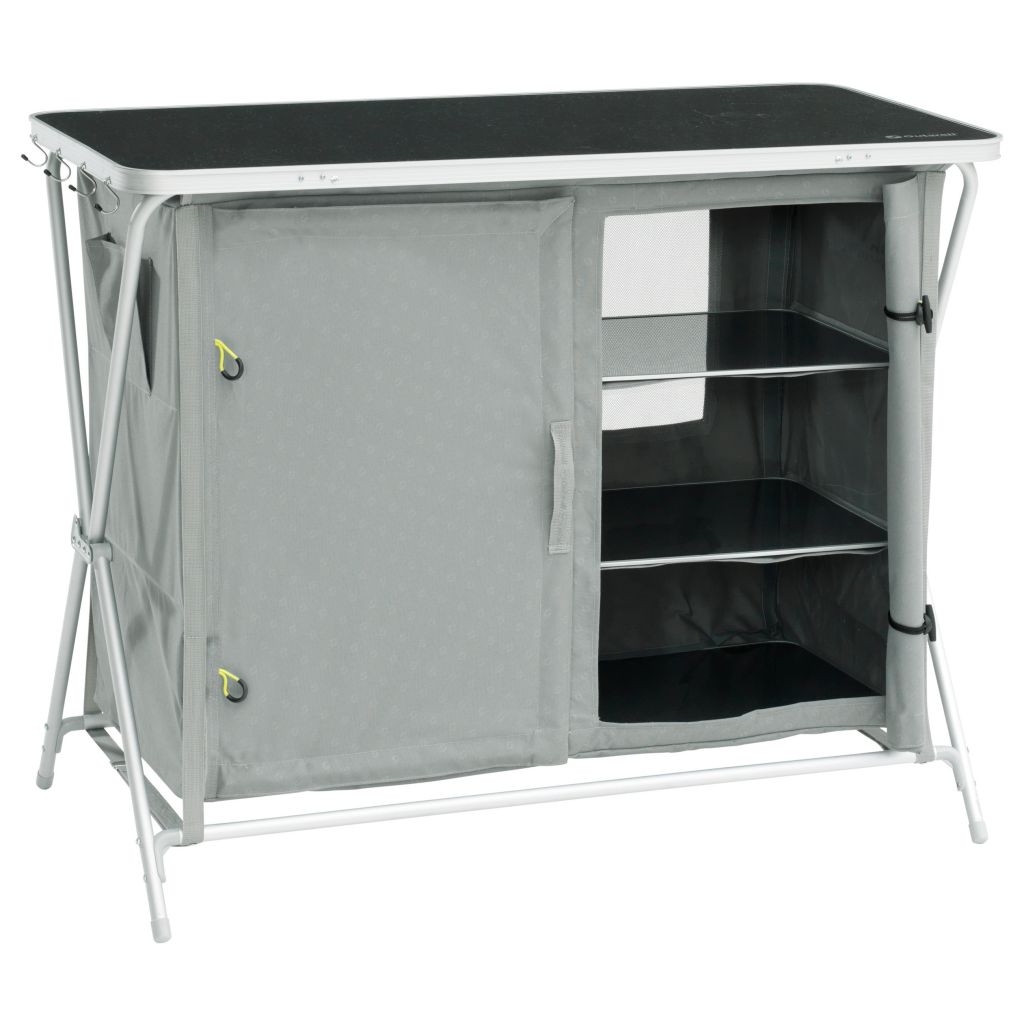 Praktische, leicht aufzubauende Schränke mit einem außenliegenden Aluminiumgestänge, das in Verbindung mit der Aluminiumauflage und den herausnehmbaren, beschichteten Einlegeböden für hervorragende Stabilität sorgt. Die Türen werden durch einfach einschiebbare Fiberglas-Rahmen geformt, eingenähte Magnete sorgen dafür, dass sich die Türen leicht schließen und öffnen lassen. Um die Schränke als offene Regale zu nutzen, können die Rahmen entnommen und die Türen aufgerollt werden. Das eingelagerte Gut wird durch in den Polyesterbezug eingearbeitete Lüftungsgitter ausreichend belüftet. Zusätzlichen Stauraum bieten seitliche Organizertaschen, die Füße sind einzeln einstellbar um Unebenheiten am Boden auszugleichen. Lieferung erfolgt inklusive einer Trage- und Aufbewahrungstasche.