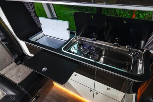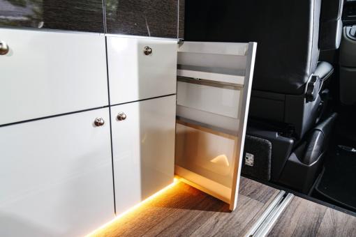 Großzügiges Möbelteil inkl. Hochschrank mit Schiebtür, Wäschefach, Staufach für 1x 5kg Gasflasche. 2 Schubladen. Der Schrank bietet viel Platz (z.B. für die Chemietoilette Porta-Potti Qube, 660102). 3 Staufächer über der Küche. Vorbereitet für Einbau einer Kühlbox.