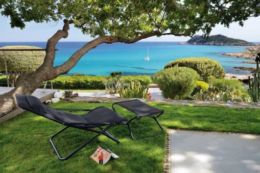 Exklusiver Liegestuhl mit großem Rahmen. Rohrstruktur ø 25 mm aus HLE-Stahl (Haute Limite Elastique), rostfrei (Korrosionsschutz) ohne Querstrebe vorne an der Sitzfläche. Armlehnen mit verstärktem Gewebe, durch Karabinerhaken in 3 Positionen verstellbar (davon eine Liegeposition). Bezug abnehmbar. Verstellbares und abnehmbares Kopfpolster. Bodenschoner. Material: Bezug oben: 100 % PES; Bezug unten: 72 % PVC, 28 % PES. 5 Jahre Garantie.